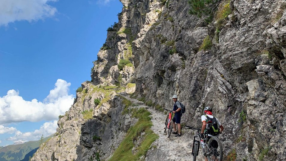 This mountain bike tour takes you through varied landscapes and is also suitable for beginners thanks to the moderate gradients. Starting in Bizau, you cycle along a tarmac toll road through woodland until just before the Vorsäßsiedlung Schönenbach. Tip: A short detour to the picturesque Vorsäßsiedlung Schönenbach (approximately 1 km) is highly recommended. Now turn right onto a goods road and continue steadily uphill to the Stogger Sattel. From here you have a stunning view over of the Hinterer Bregenzerwald mountains. Next, enjoy a steep descent along an alpine path, followed by a more relaxed ride on a narrow tarmac road past scenic mountain meadows. At Au, join the cycle path alongside the Bregenzerache to Schnepfau. The final 1.5 km climb to the Schnepfegg district is steep but manageable. From there, take the mountain road with little traffic to Bizau.