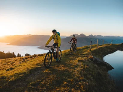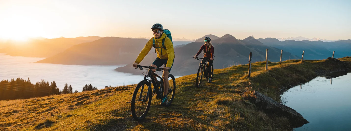 The tour up the Hahnenkamm starts in front of the hotel and requires a good level of fitness, as the path becomes extremely steep several times. The 1,150 metres of altitude gain should not be underestimated. We can warm up our legs well on the Brixental Valley cycle path as far as Kitzbühel. After passing the valley station of the Hahnenkamm cable car, the ascent begins quite steeply, but the path soon levels off a little. In the shade of trees, the gravel path leads us steadily uphill. Shortly after the hermitage, the path becomes steeper again. In the final section of the ascent, we are exposed to the sun and can soon spot the mountain station of the Hahnenkamm cable car. If you wish, you can take a detour to the mountain station but the path continues towards Pengelstein. Passing the Ehrenbachhöhe, we lose a few metres of altitude. From the Hochbrunn mountain inn, the trail climbs once more. At the top, a flat path leads us to the Pengelstein restaurant and the 3S cable car. Here, we begin our first descent towards the Usterkaralm. The first few metres are on rough gravel, requring us to push the bike in places. However, this is followed by a beautiful descent, past the Usterkaralm and the Hiesleggalm, down to the Schirast. Finally, we return to Kirchberg on cycle path no. 204.