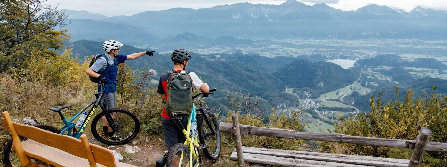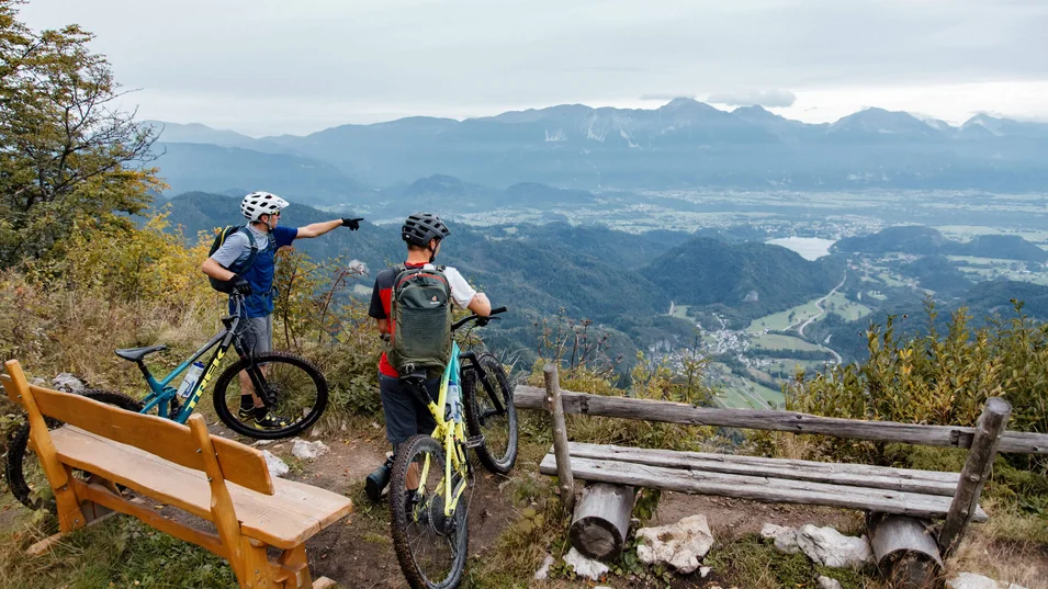 Just as the Štruklji (dough rolls) are the most famous traditional Slovenian dish, the mountain hut on the Kofce mountain pasture is known for the best Slovenian Štruklji among all Slovenian Alpine Club huts. So this is a great motivation for us to tackle the 15 km ascent. First, we ride slightly uphill through the Tržiška Bistrica valley, whereupon, after almost 7 km of asphalt road in the village of Jelendol, the ascent follows on a gravel path, which is not technically demanding. After reaching the Pungart pasture and enjoying the view of the Karavanke peaks, the last short section of the ascent to the Šija pasture awaits us, followed by a gentle descent to the Kofce pasture. This is followed by a well-earned meal in the mountain hut directly below the Veliki vrh peak with a view of Triglav. There are several options for the descent back to Tržič: technically undemanding on the gravel path to Jelendol and on to Tržič, or on the technically more demanding route via the Kal pasture (partly a footpath).