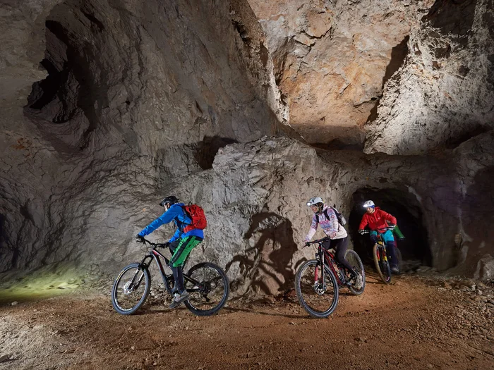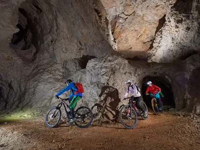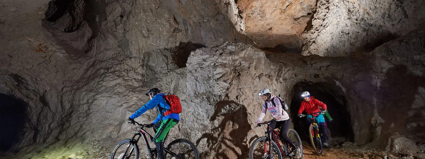 Start of the tour: Bike-Base - Eco-Hotel Koros. This special and unique bike tour takes you through the mountain and the history of mining in the Karawanken Geopark. As the visit to the Petzen Underworld is tied to a fixed schedule (the guided tours are only at 10 am and 2 pm), you must book the tour in advance. The tour is possible every day and in all weathers, except on Mondays, as the museum is closed on this day. The tour is actually ideal for rainy days, as it is dry in the underworld all the time. Due to the constant temperature of around 9 degrees, warm clothing is recommended! Most of our bikers opt for the morning downhill ride (9 km) and then ride along the main road (6 km) with a slight climb to the mining museum in Mežica. From here, you will take a shuttle to the entrance in Črna, but from there you will cycle through the tunnel back to the museum. From Mežica, you can then cycle back to Jamnica past panoramic gardens on local asphalt or fort roads.
