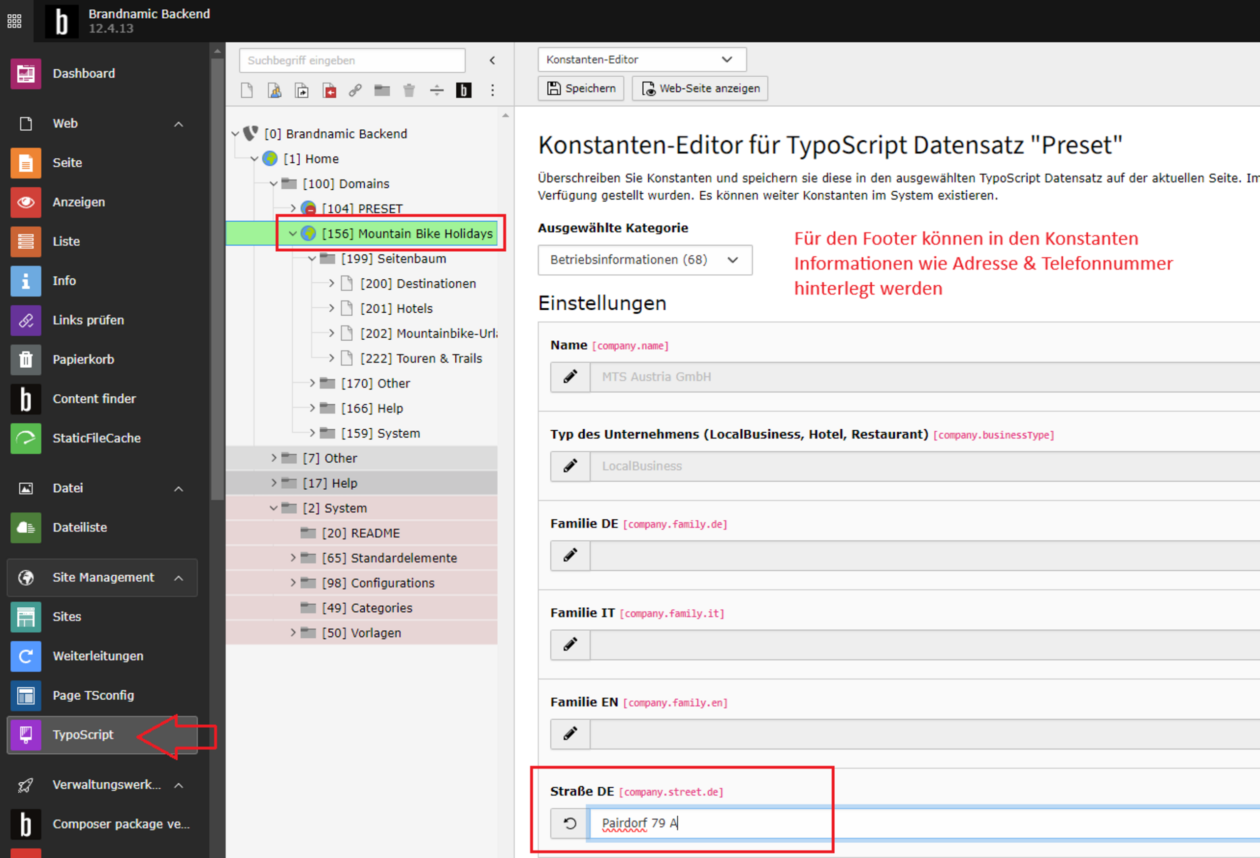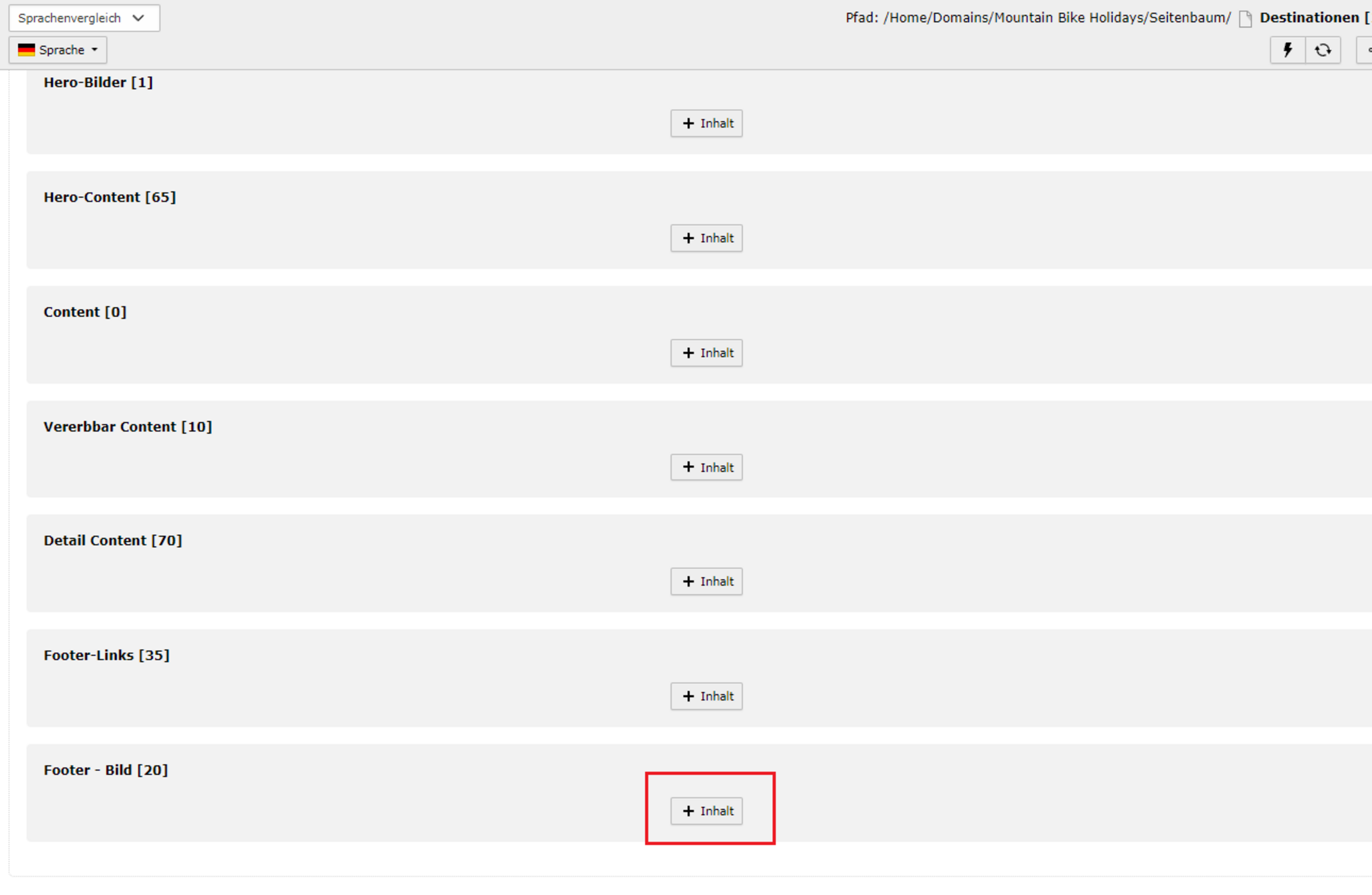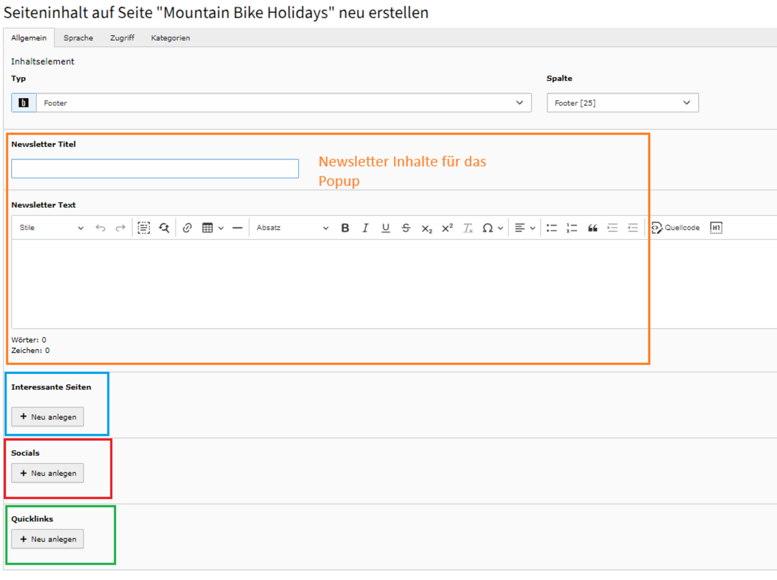 Der Footer ist das letzte Element am Ende einer Seite. In diesem Element können über verschiedene Repeater-Boxen Inhalte für den Footer definiert werden. Dieses Element kann nur auf der Home gepflegt werden und wird auf alle Unterseiten vererbt. Daher sind hier nur sehr „statische“ Inhalte pflegbar, die nicht pro Unterseite variieren können. Für die variablen Inhalte gibt es weitere Typo3-Elemente.