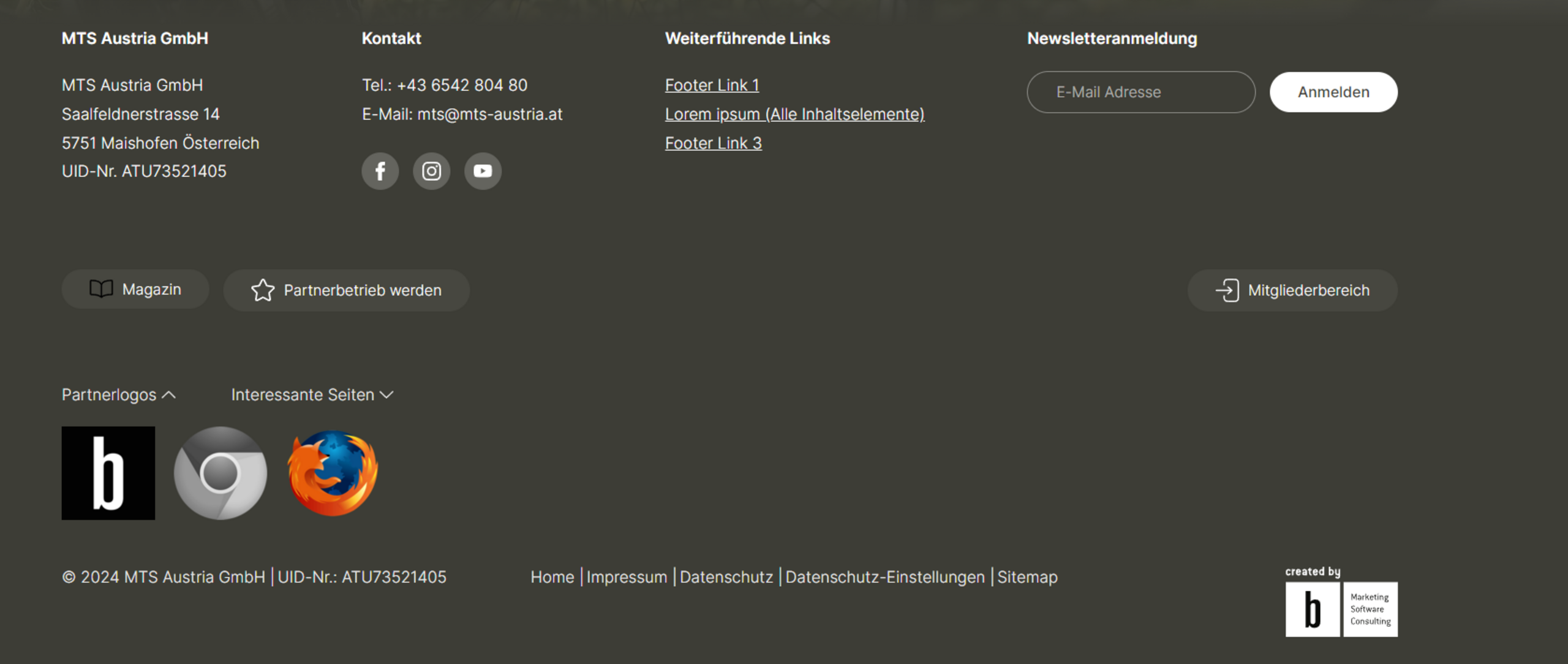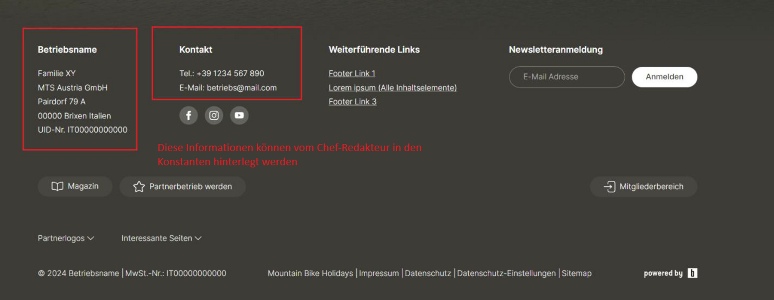 [Chef-Redakteur]: Die grundlegenden Informationen wie Adresse und Kontakt werden in den Konstanten gepflegt. Der Login zum Mitgliederbereich wird nur angezeigt sofern in den Konstanten die ID der Login Seite eingepflegt wurde.