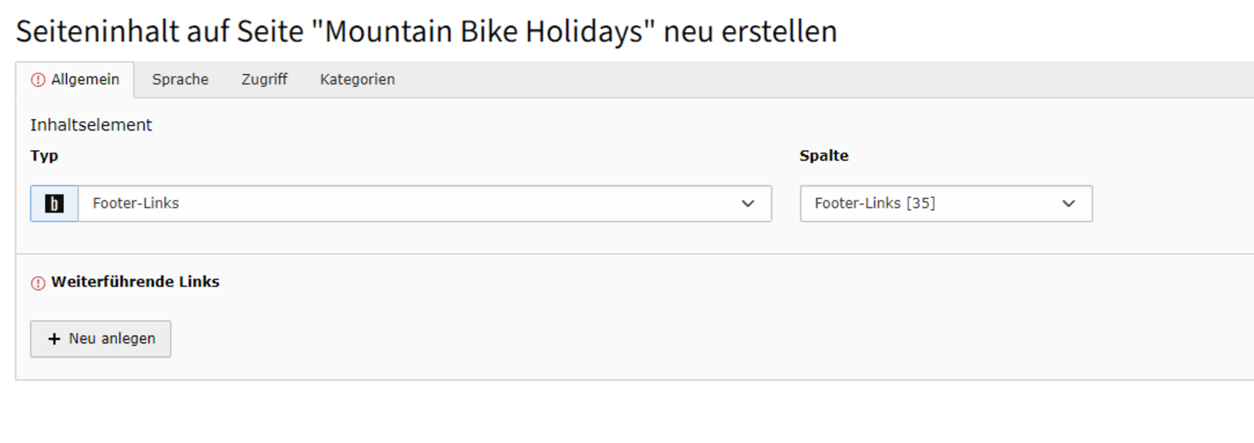 Dieses Element kann auf allen Seiten in der Spalte “Footer-Links” gepflegt werden und dient dazu, weiterführende Links, anzugeben, damit ein Benutzer am Ende der Seite noch bequem zwischen weiteren/ähnlichen Seiten wechseln kann. Wenn die Footer-Links auf einer Seite nicht gepflegt sind, werden diese von der übergeordnete Seite vererbt.