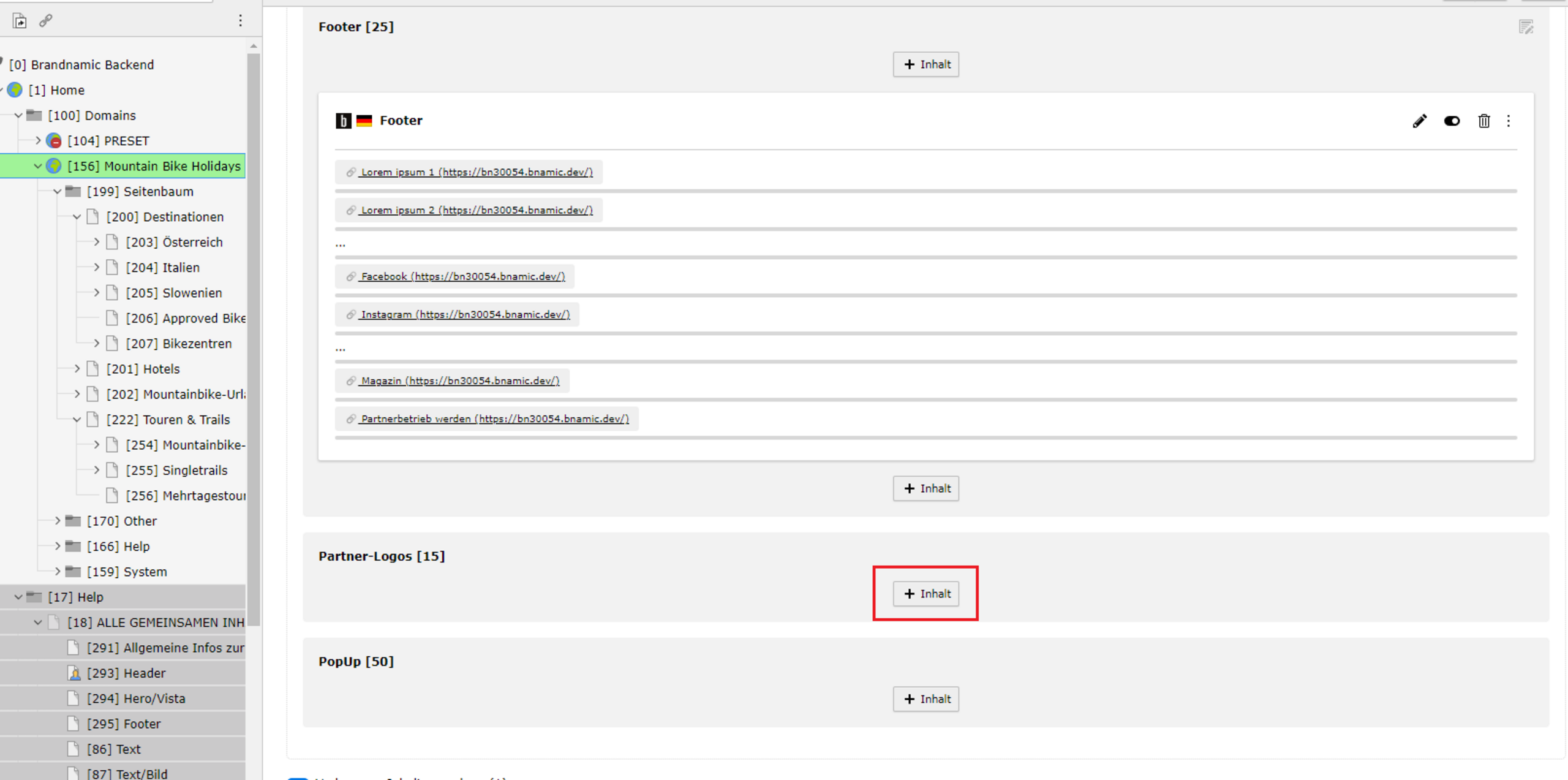 Mit dem Element „Partner-Logos“ können die Logos von Partnern gepflegt werden. Dabei kann pro Logo ein Link hinterlegt werden. Das Element wird nur auf der Home in der Spalte “Partner-Logos” gepflegt und auf alle Unterseiten vererbt.