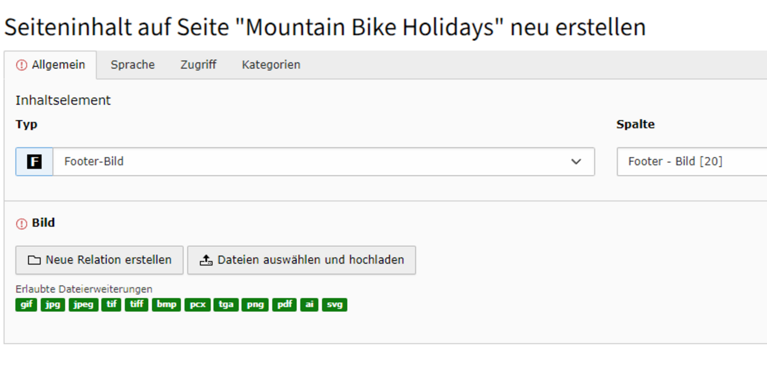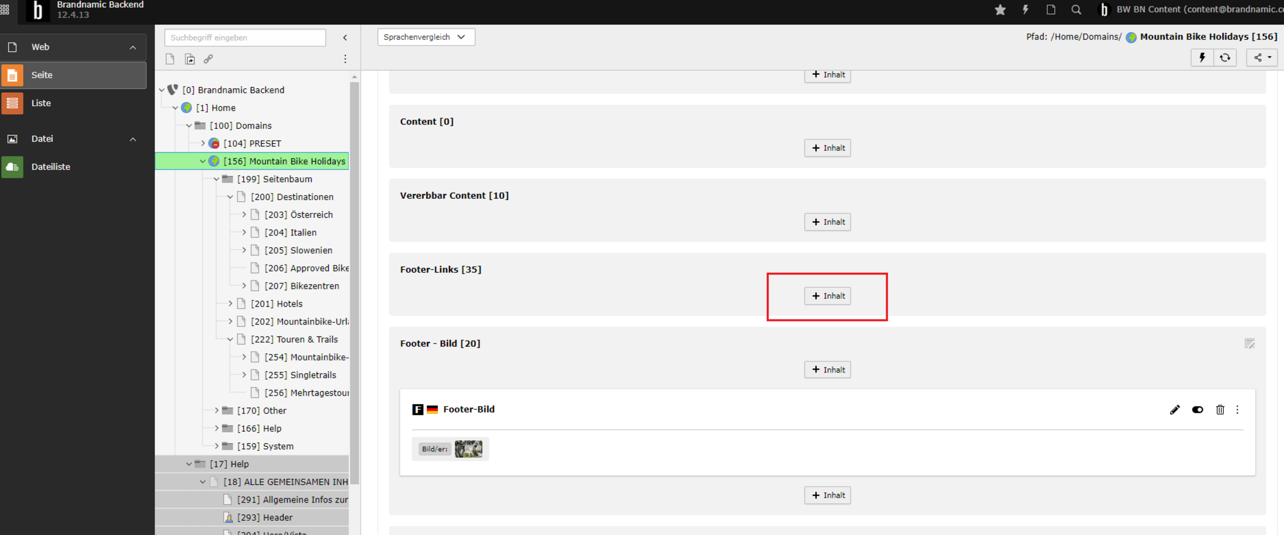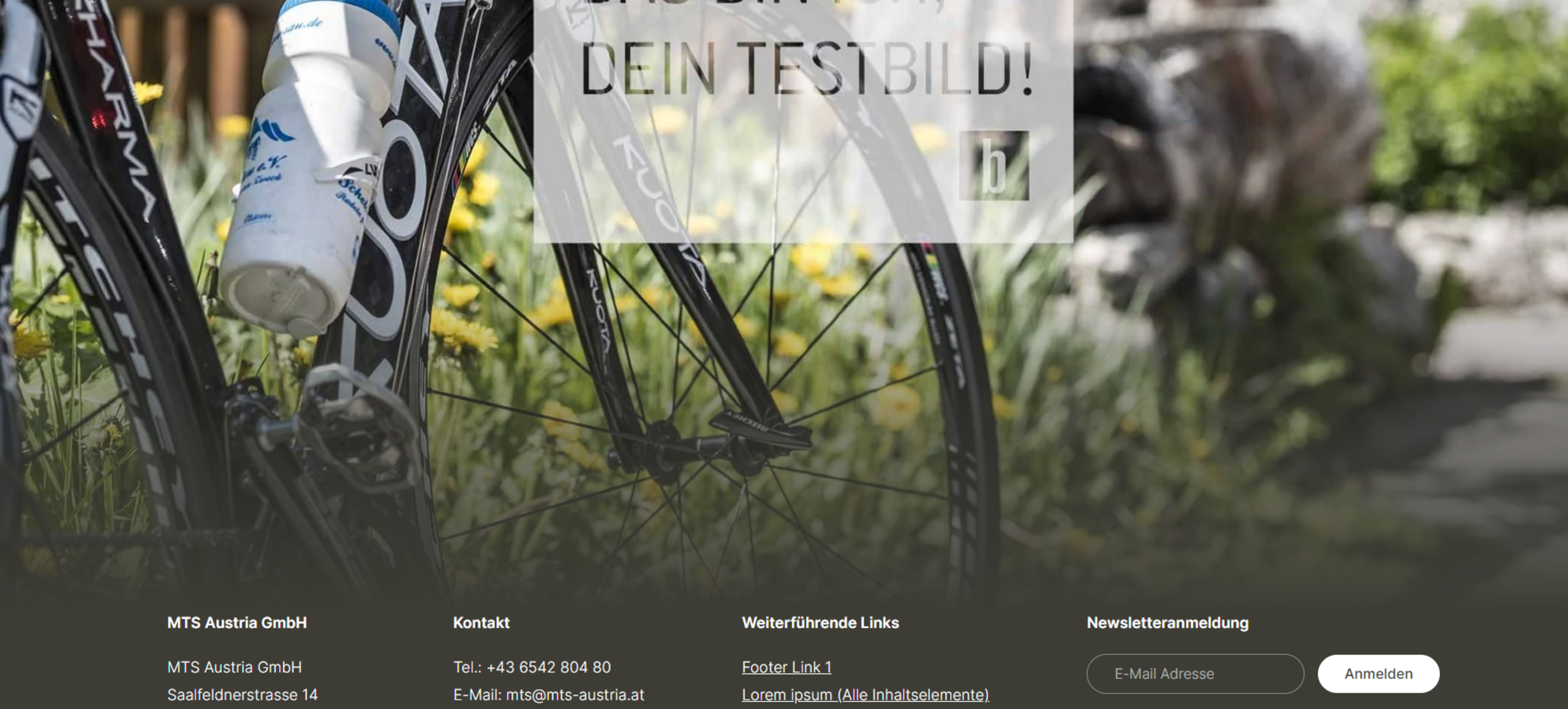 Das Element „Footer-Bild“ dient dazu, ein Bild für den Übergang zum Footer zu pflegen. Es kann auf jeder Seite in der eigenen Spalte “Footer - Bild” neu vergeben werden. Falls auf einer Seite kein Bild hinterlegt wurde, wird jenes der übergeordneten Seiten vererbt.