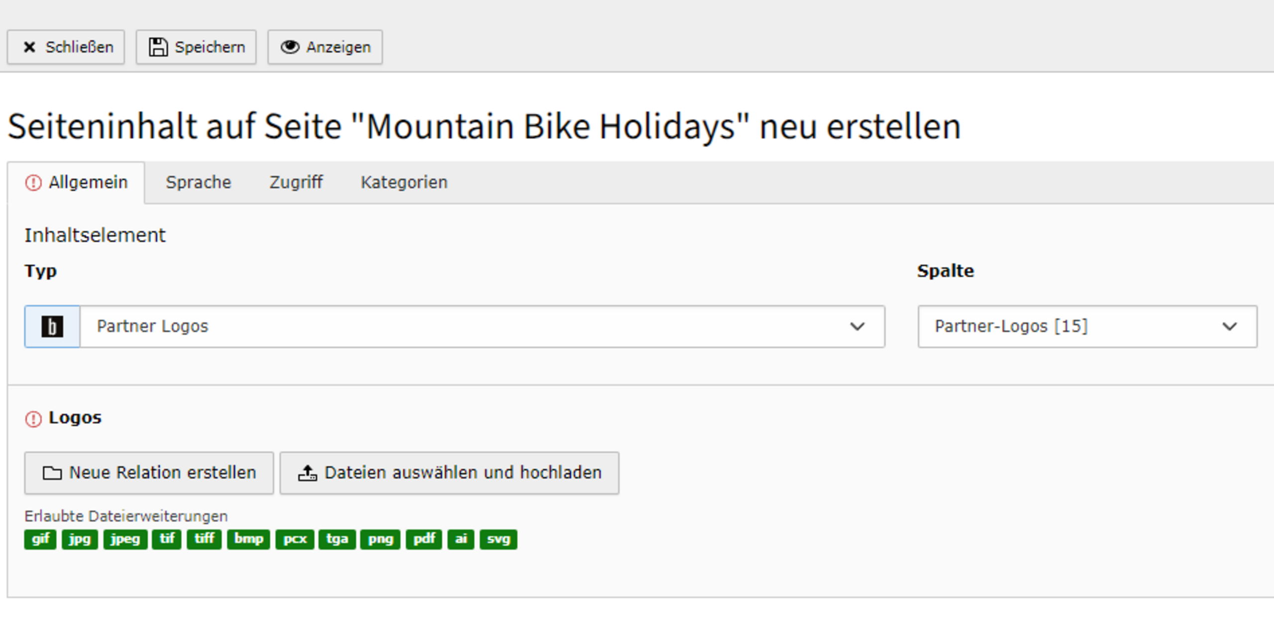 Das Element kann auch in der Spalte “Content [0]” verwendet werden um auf einer eigenen Unterseite die Logos der Partner darzustellen.