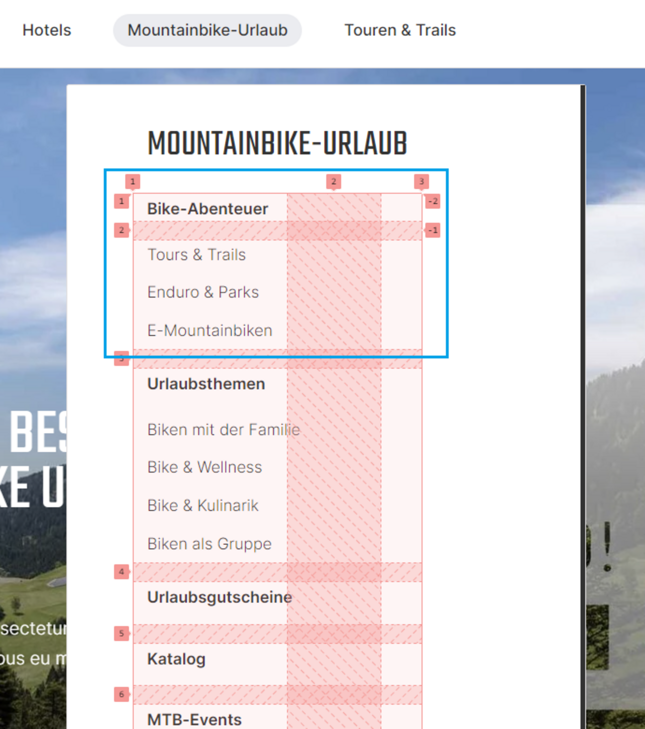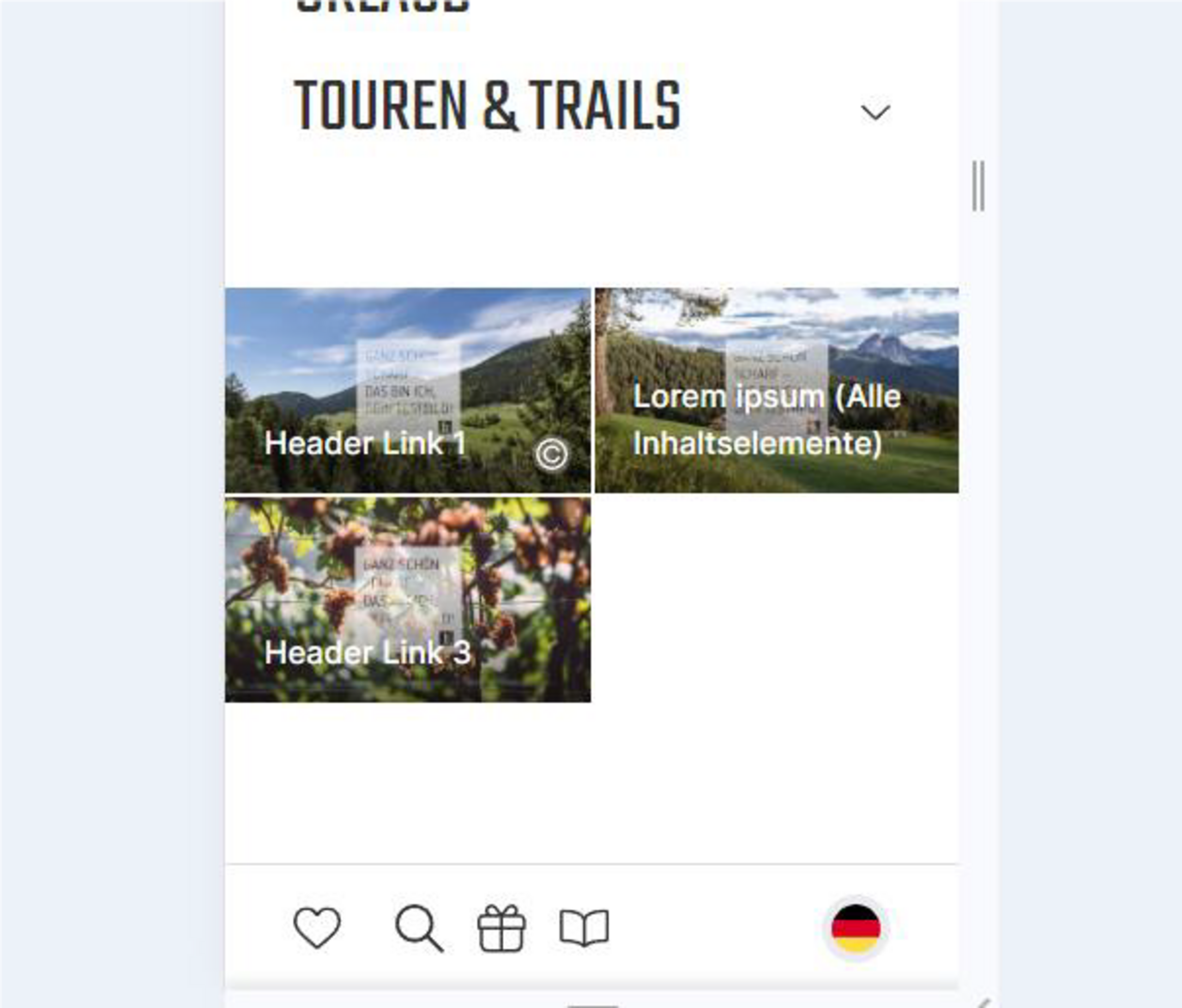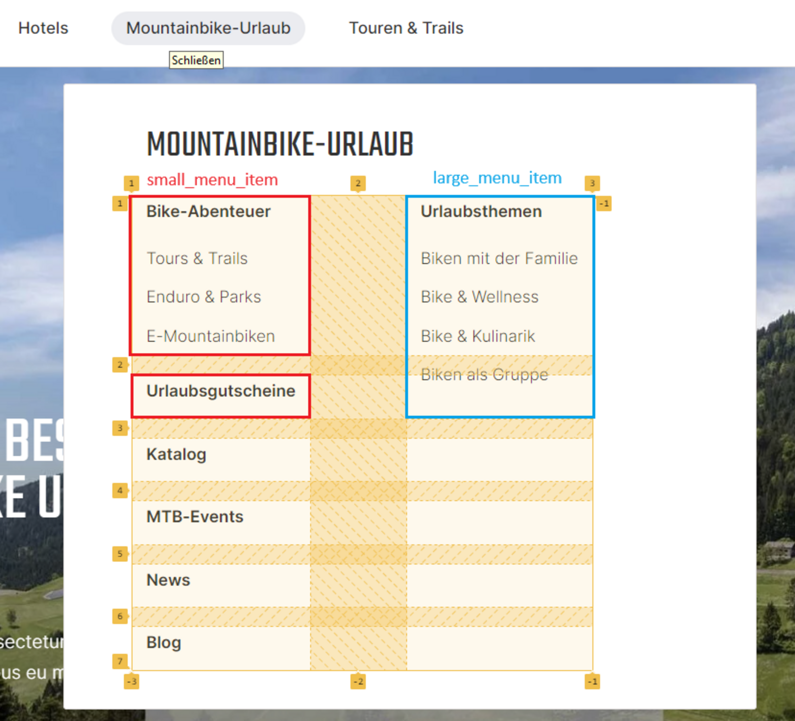 Das Menü auf der zweiten Ebene hat ein „Block“-Layout bei der Desktop-Ansicht und jede Seite kann individuell in der Breite und Höhe angepasst werden, indem bestimmt wird, wie viele Spalten oder Zeilen das Menü-Item einnehmen soll. Dazu wird bei den Seiteneigenschaften der jeweiligen Seite ein bestimmter Key in einem Spezialfeld hinterlegt.