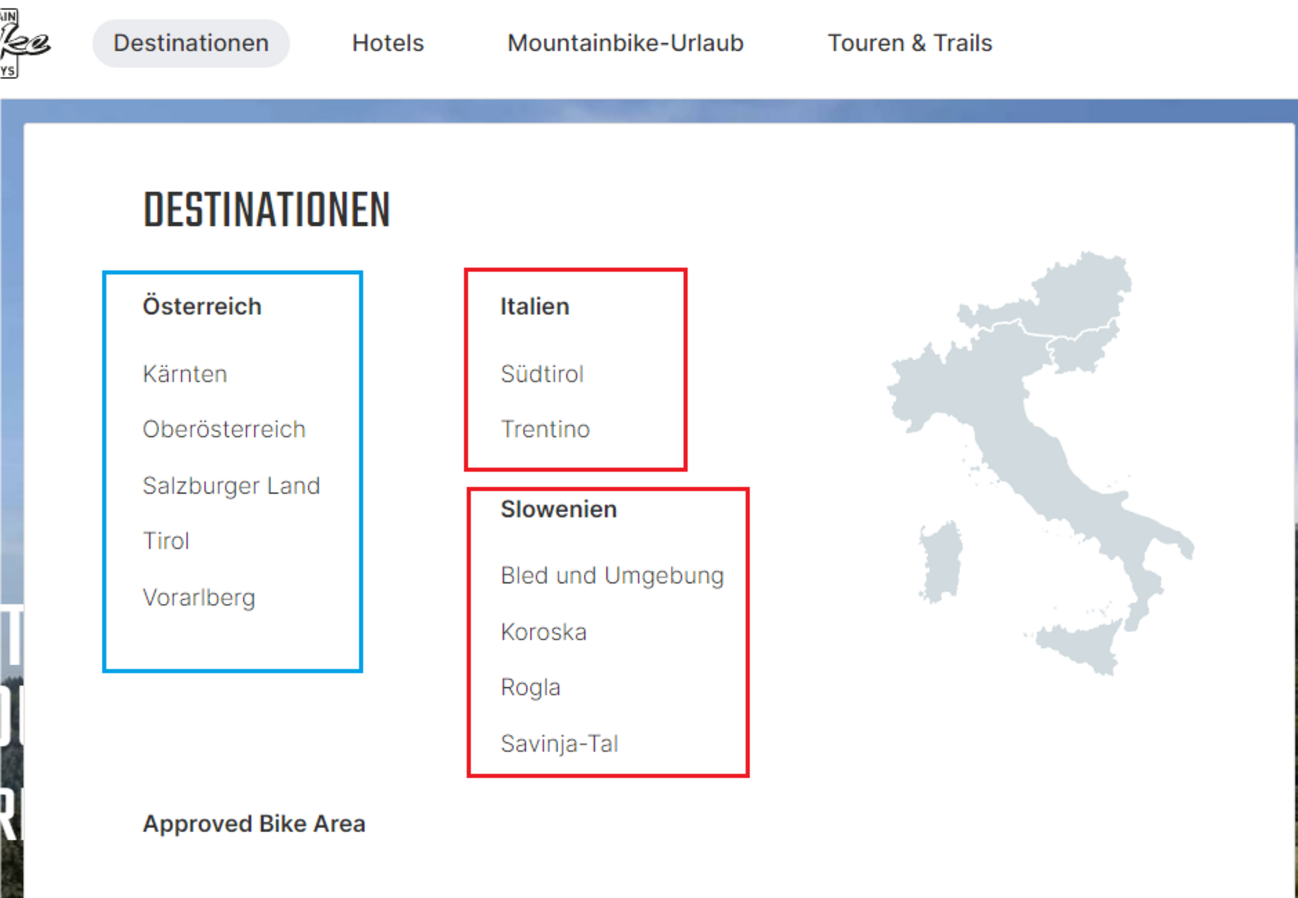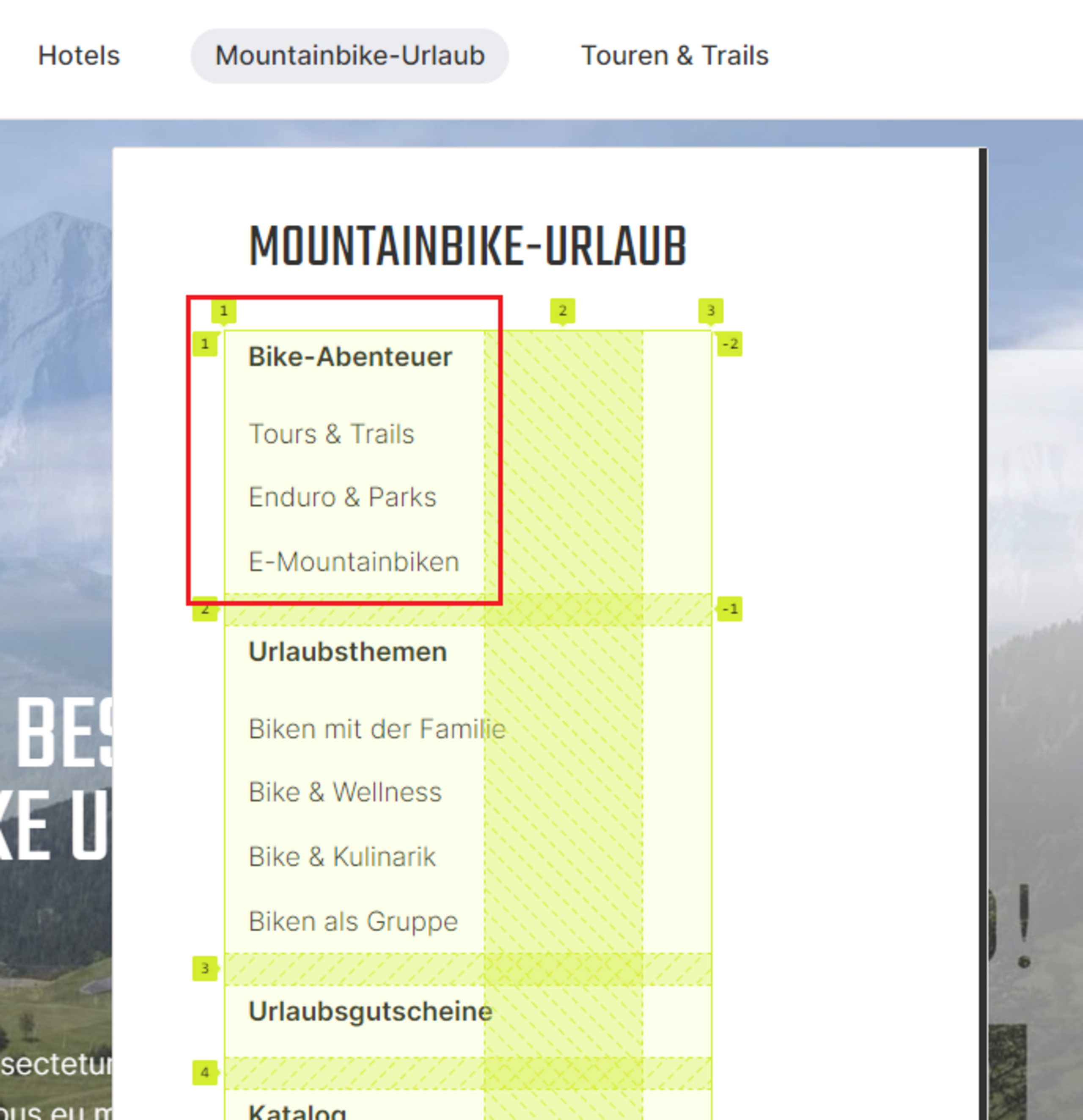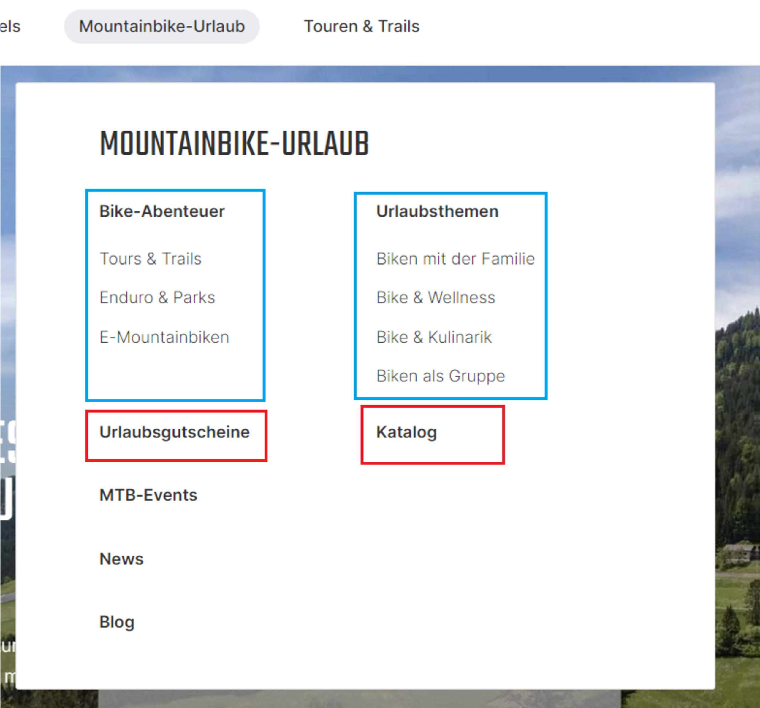 Das Menü auf der zweiten Ebene hat ein „Block“-Layout bei der Desktop-Ansicht und jede Seite kann individuell in der Breite und Höhe angepasst werden, indem bestimmt wird, wie viele Spalten oder Zeilen das Menü-Item einnehmen soll. Dazu wird bei den Seiteneigenschaften der jeweiligen Seite ein bestimmter Key in einem Spezialfeld hinterlegt.
