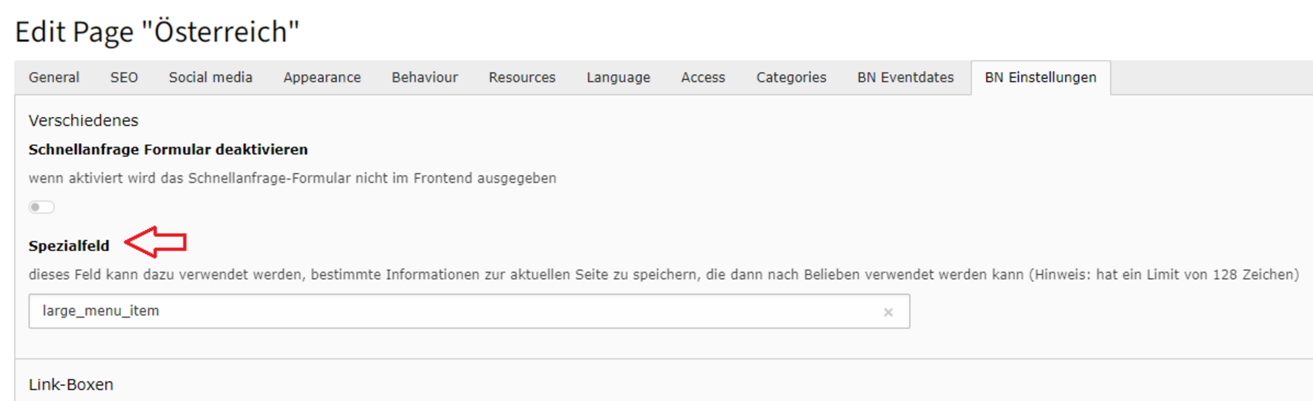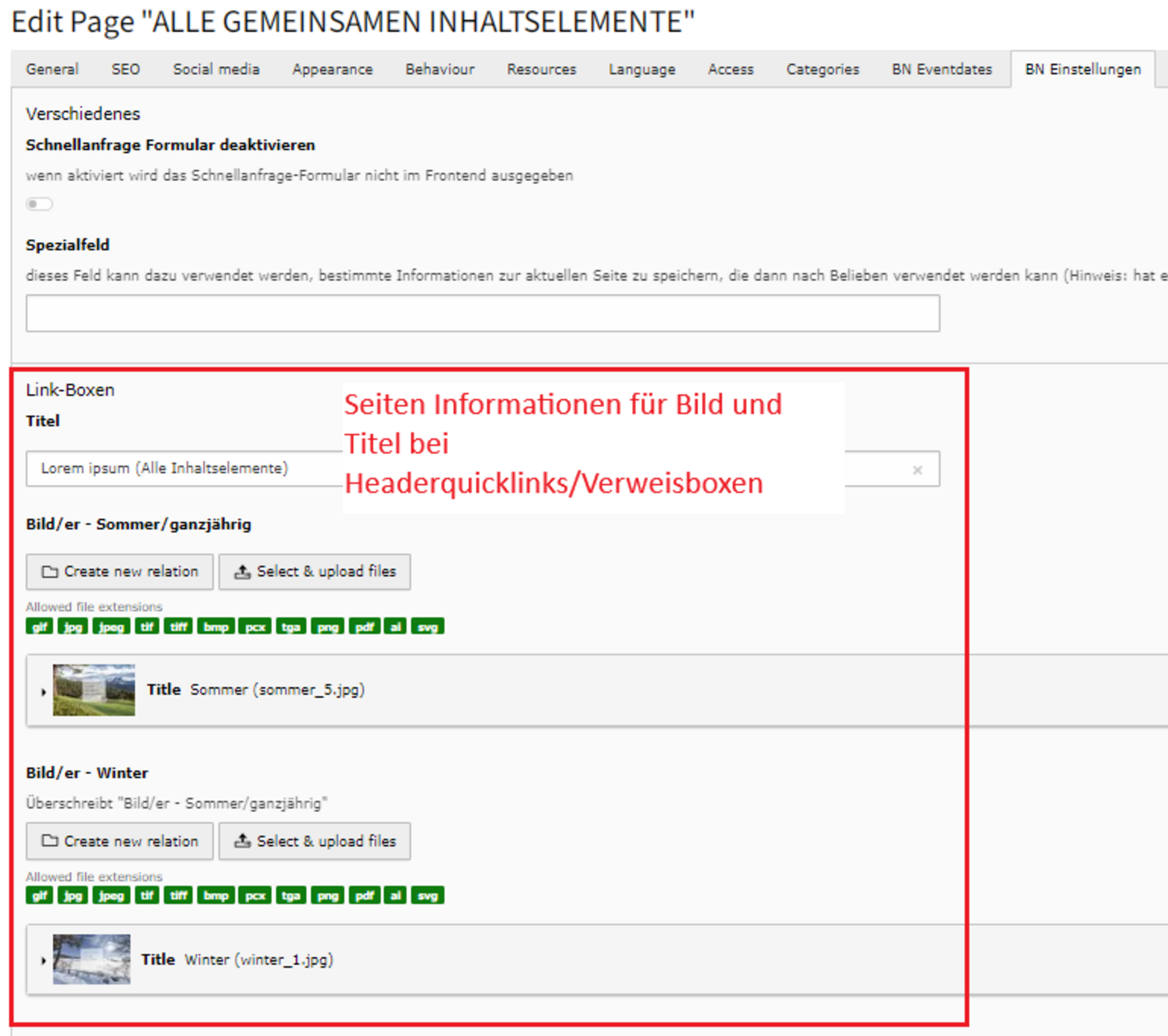 Die Informationen, die für die Repeater-Boxen ausgelesen werden, können in den Seiteneigenschaften im Reiter „BN Einstellungen“ hinterlegt werden.