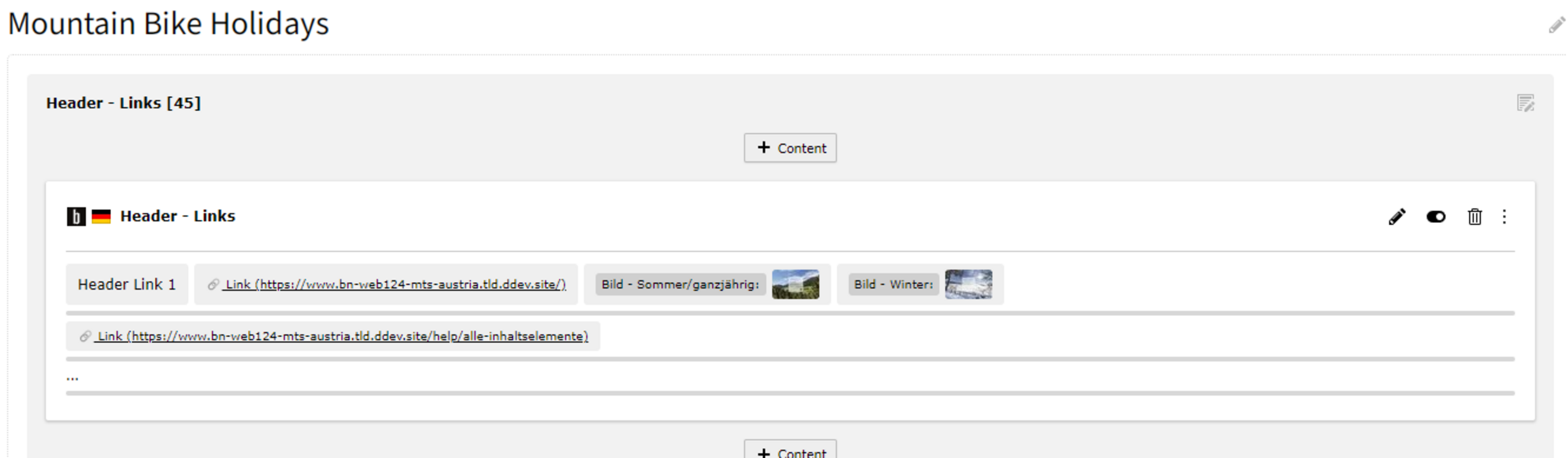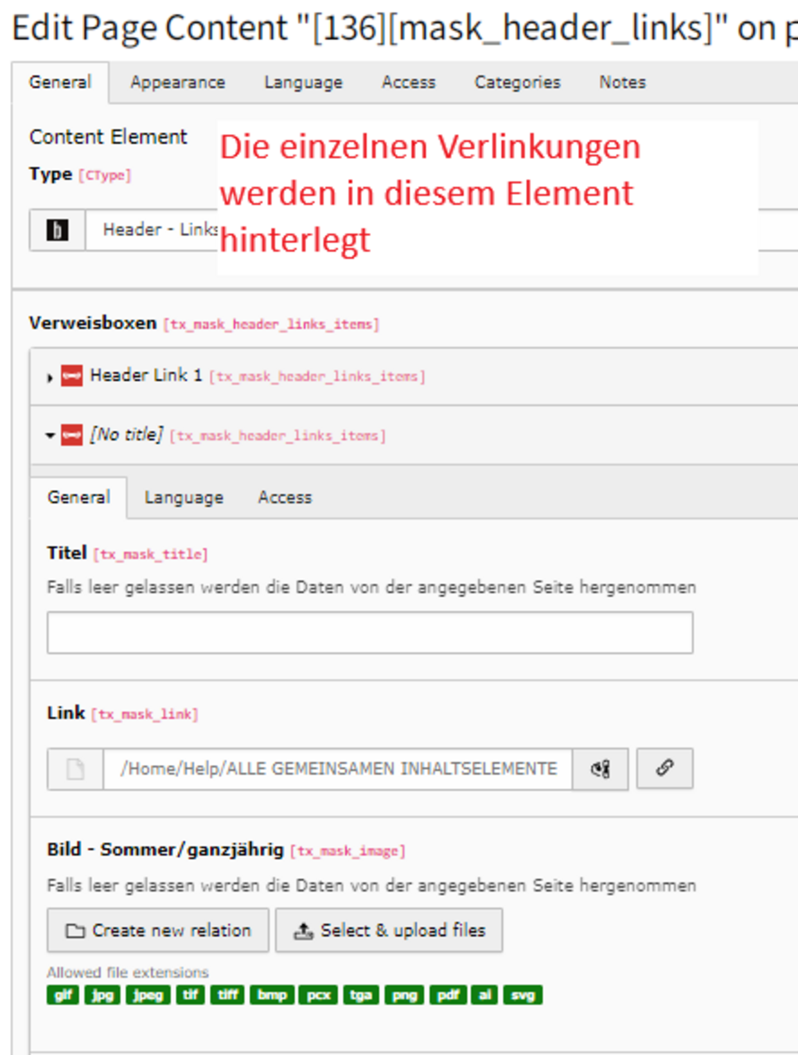 Diese können im Typo3-Element „Header-Links“ einmalig auf der Home Seite hinterlegt werden. Sie werden dann auf alle Unterseiten vererbt.