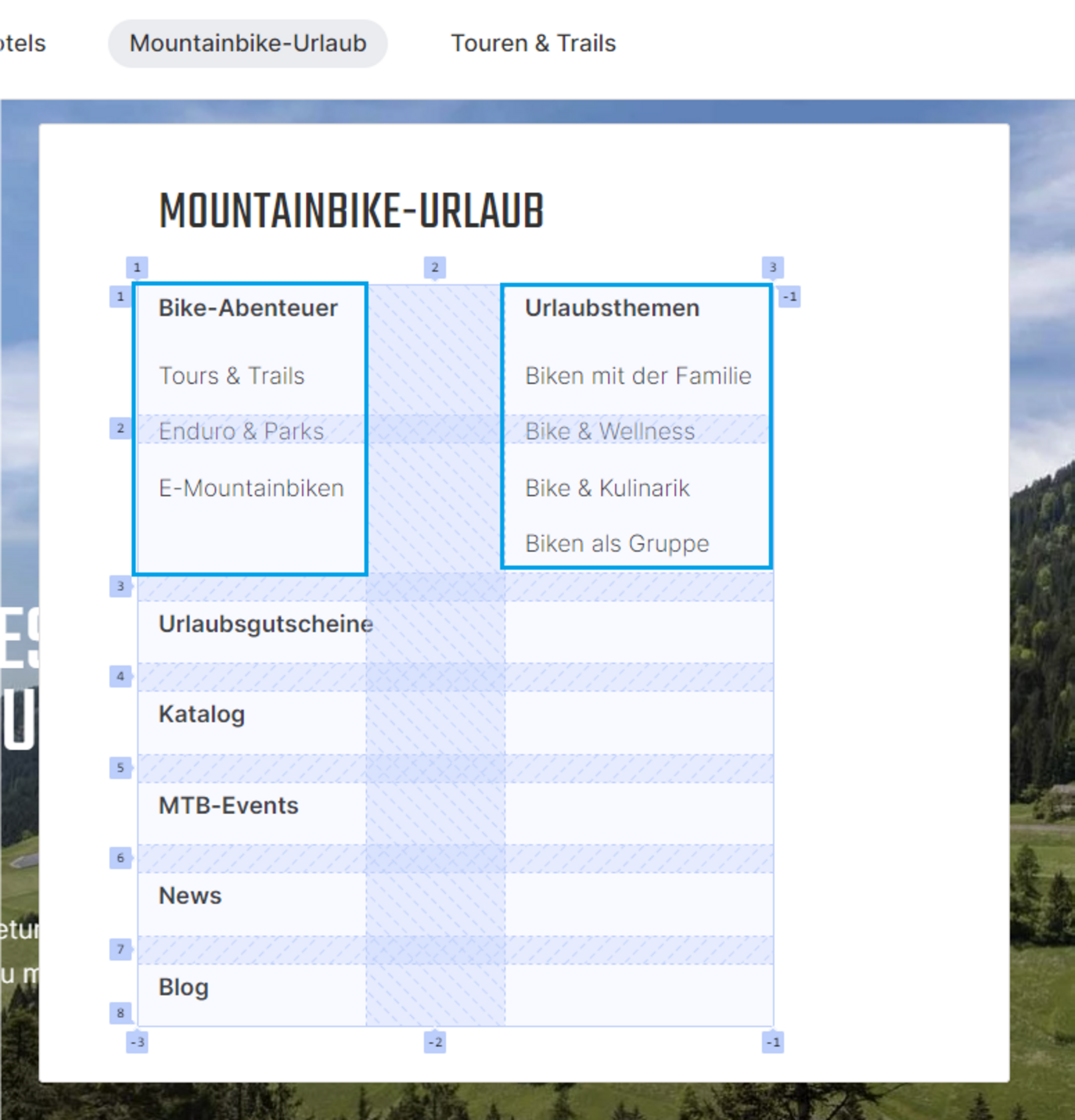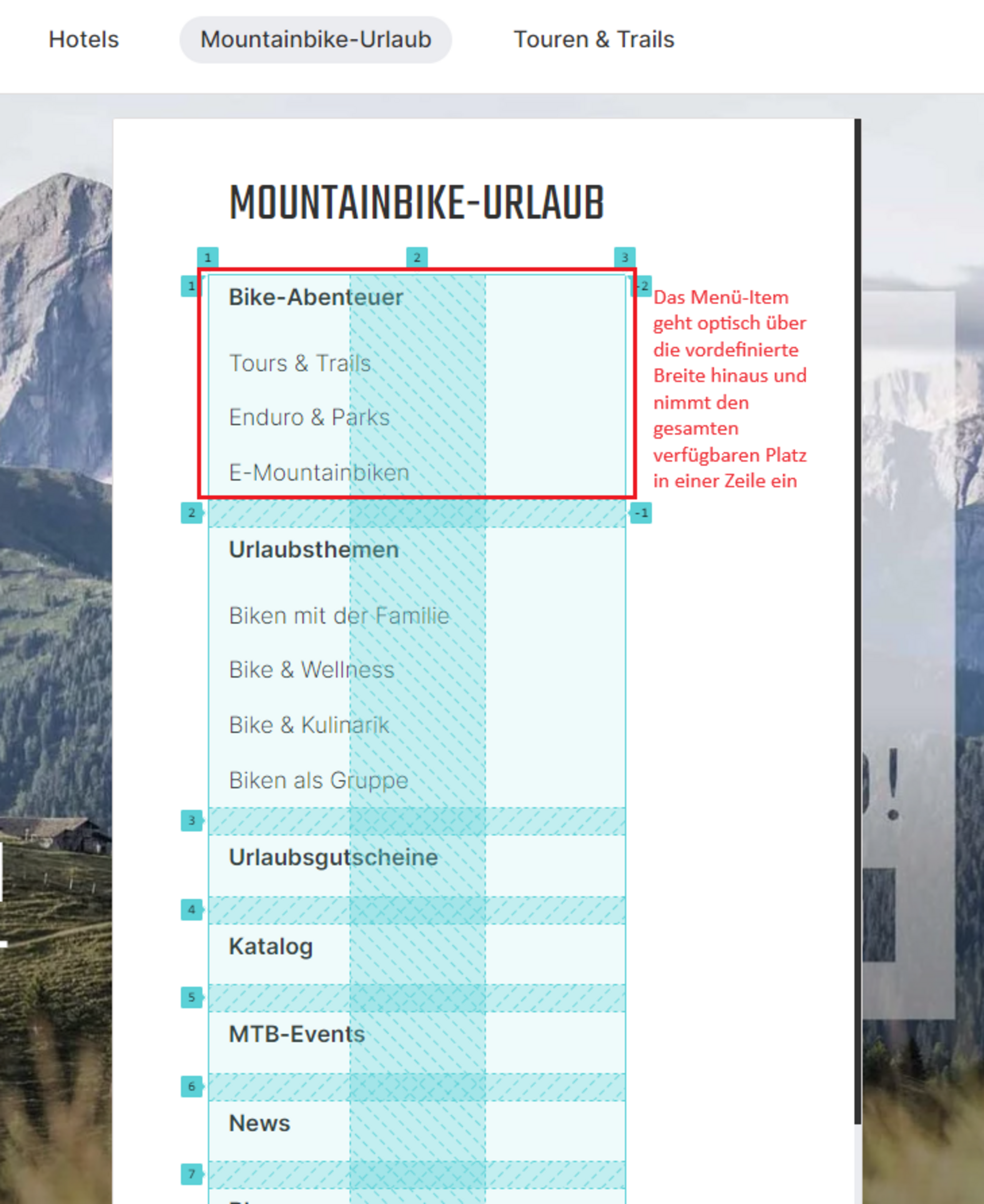 Der blau eingerahmte Menüpunkt geht über zwei Zeilen hinaus. Optisch ist bei dieser Einstellung kein Unterschied zu erkennen, erst in Kombination mit einer Einstellung in einer anderen Seite wird optisch eine Veränderung sichtbar. Diese Einstellung dient dazu einen Menüpunkt in der Höhe zu vergrößern, um z. B. auf der gegenüberliegenden Seite zwei Menüpunkte darstellen zu können.