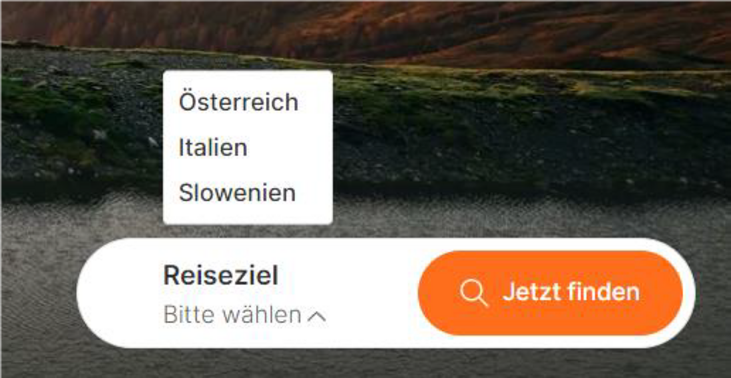 Der mitscrollende Button mit einer Auswahl von vorhandenen Ländern öffnet bei Klick auf „Jetzt finden“ den Urlaubsplaner mit vorausgewähltem Land.