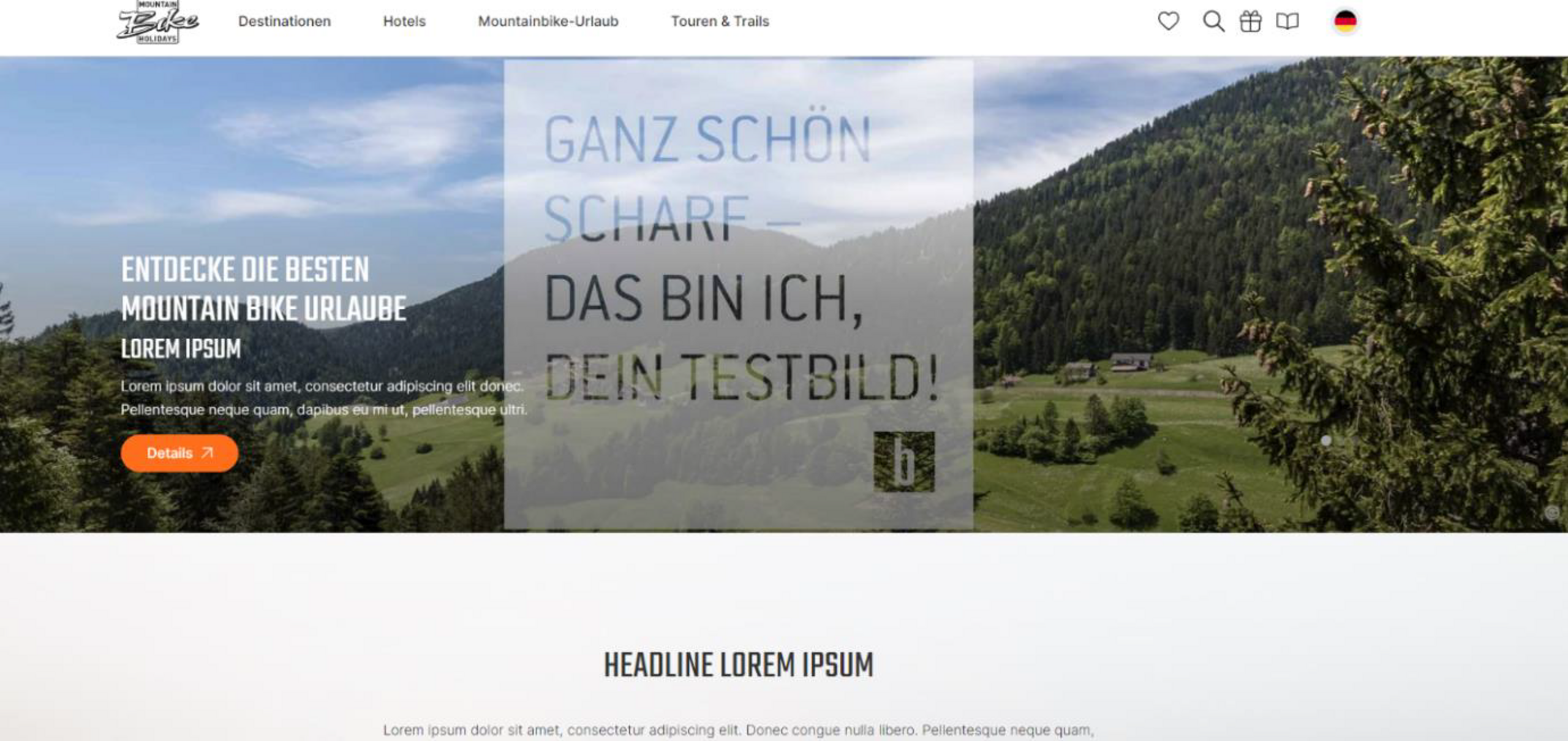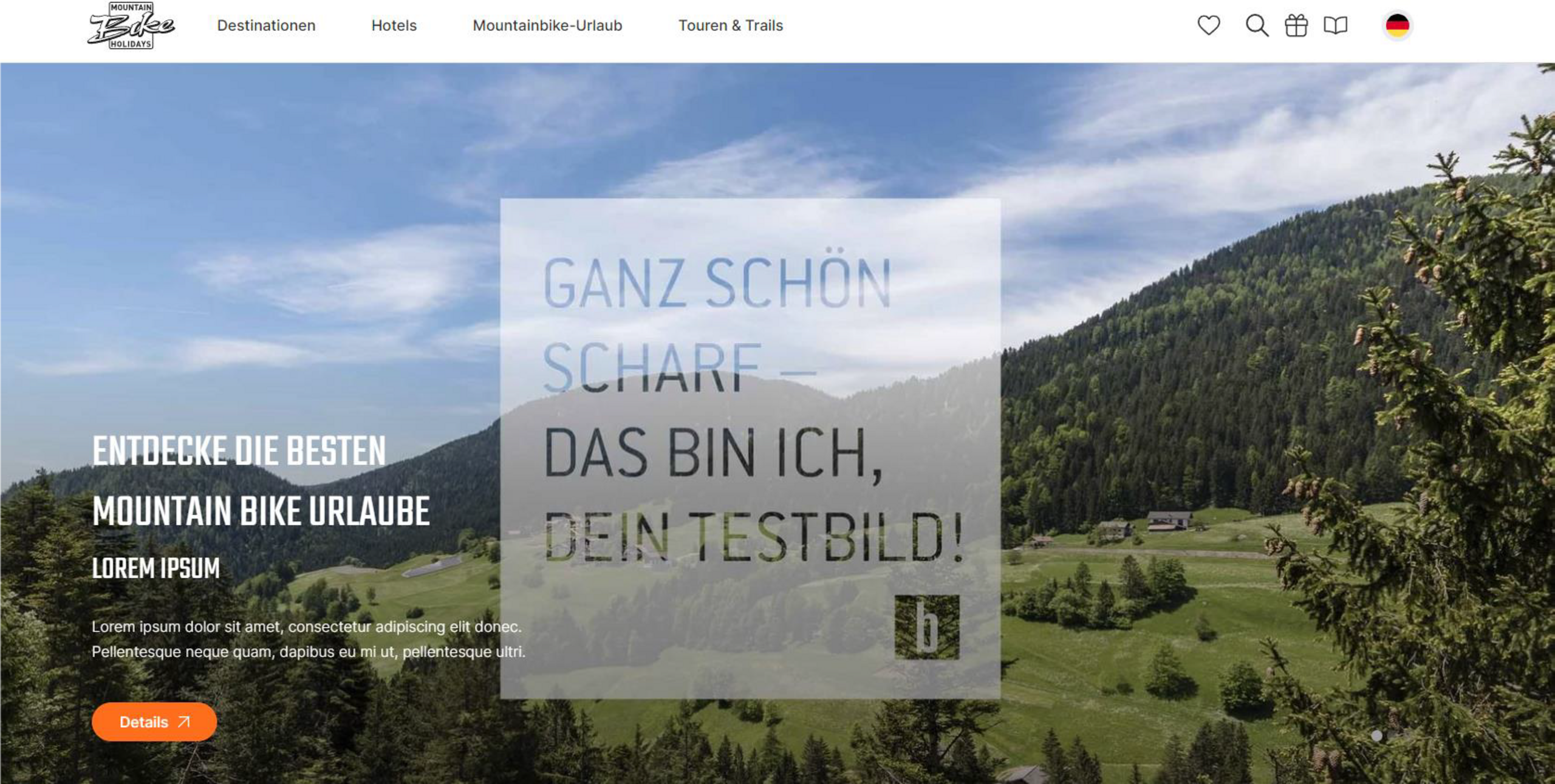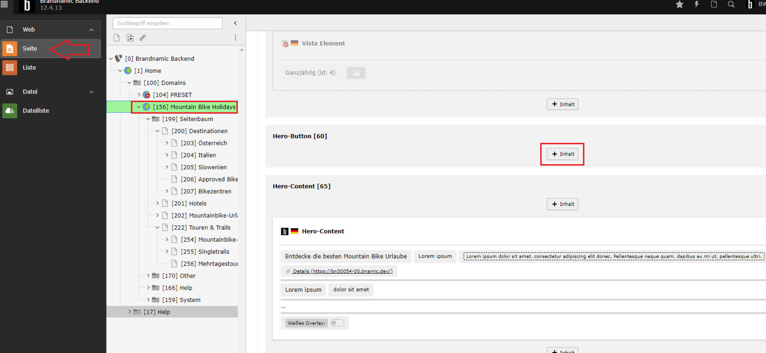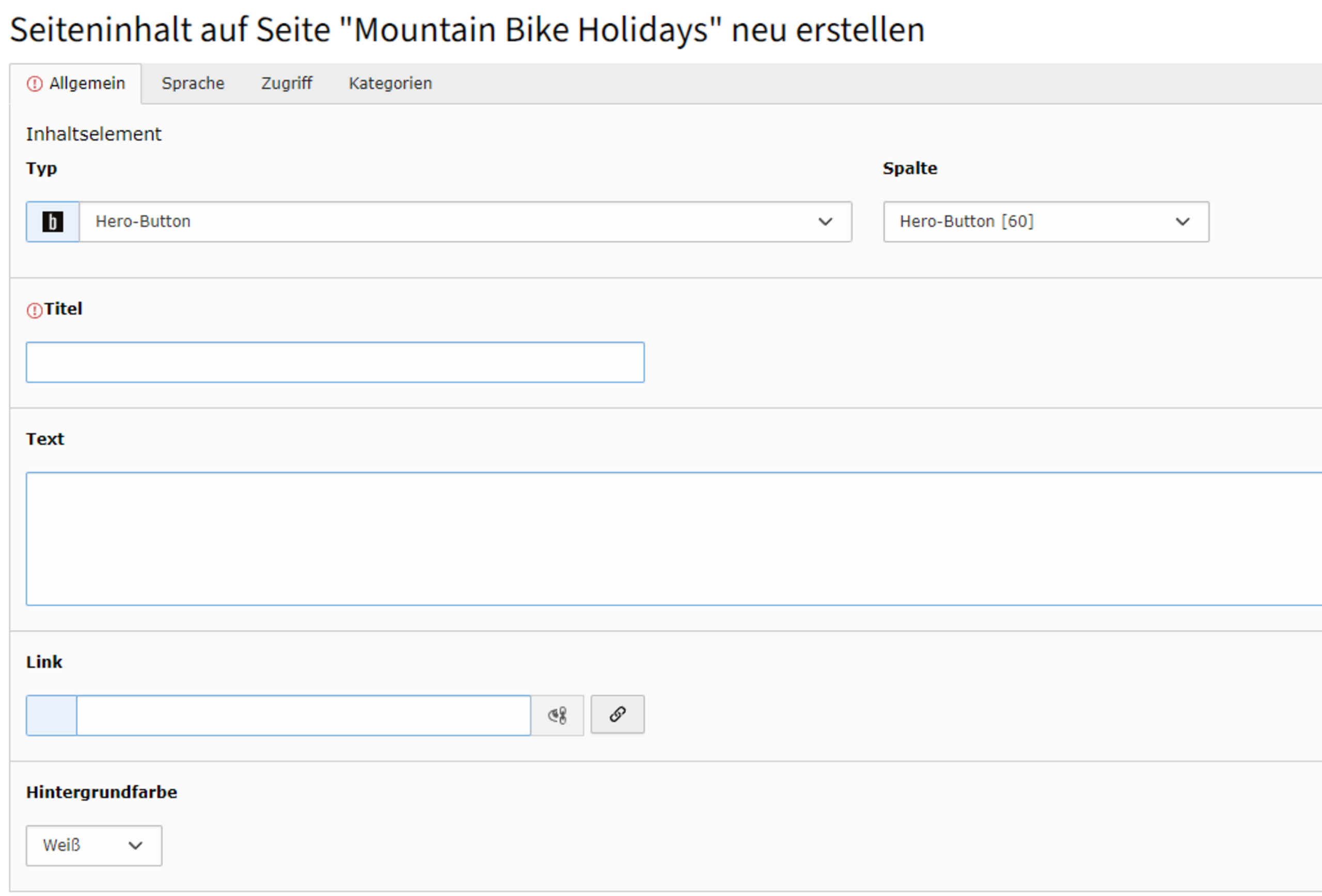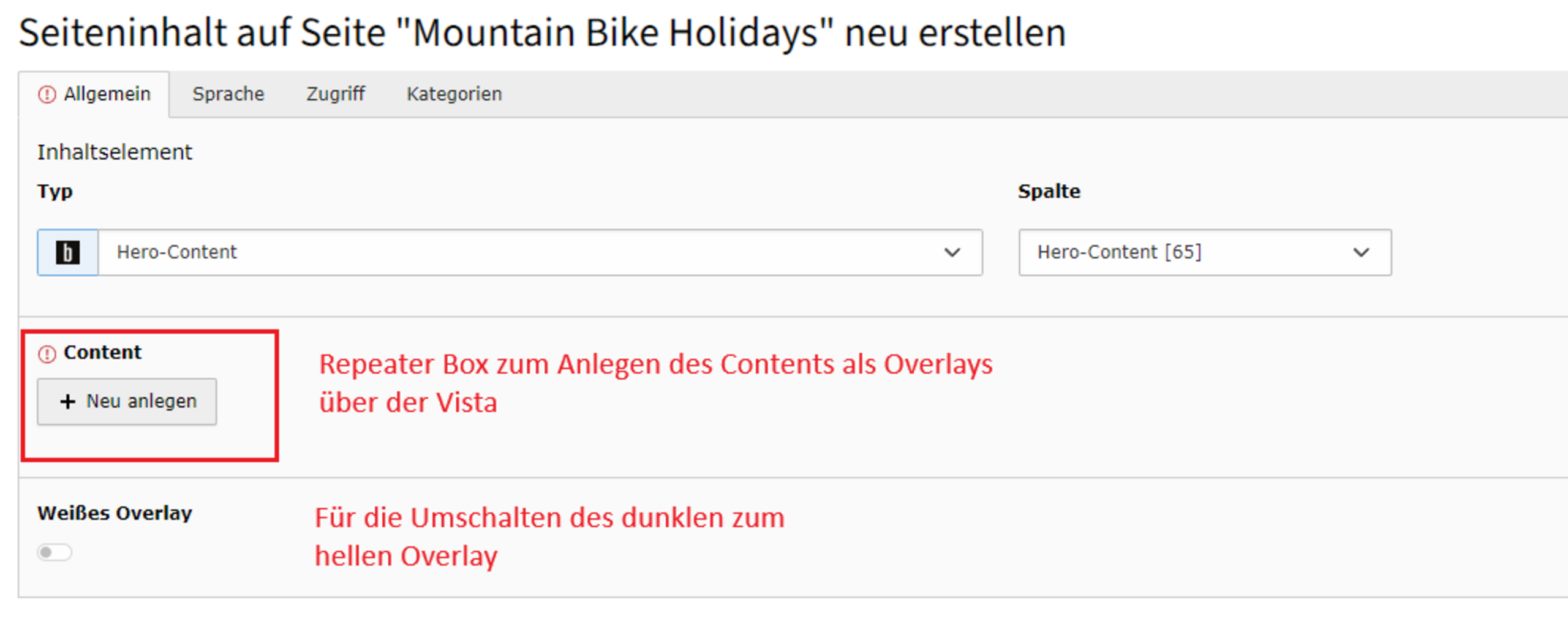 Für alle Seiten mit einem Hero/Vista kann über den Bildern ein Overlay mit Titel, Text & Button gepflegt werden. Dies wird im Typo3 in der Spalte „Hero-Content“ im gleichnamigen Element gepflegt.