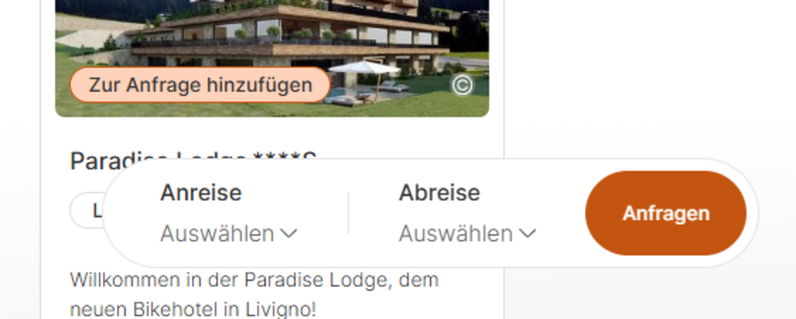 Die mitscrollende Auswahl von Anreise und Abreise leitet auf die Sammelanfrage mit dem Anfrageformular weiter. Diese Leiste wird statt des Urlaubsplaners angezeigt.