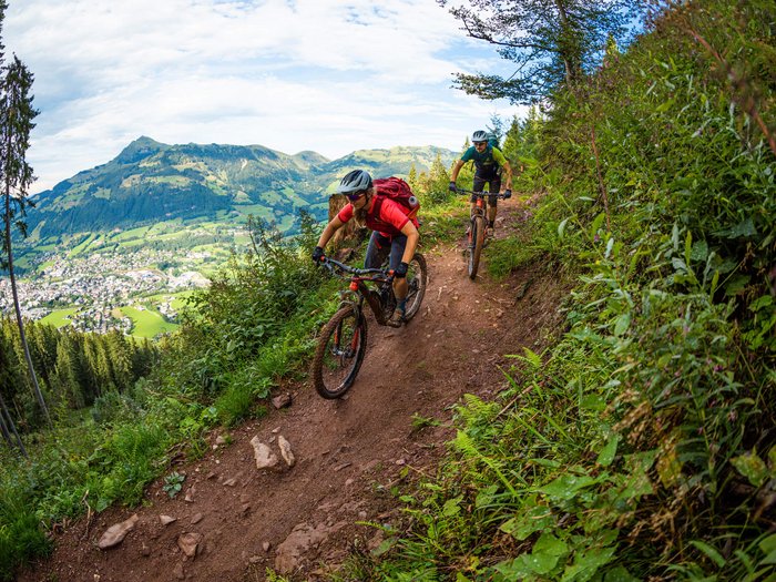 Auch wenn die Assoziation zum spektakulärsten und gefährlichsten Skirennen der Welt etwas anderes vermuten läss: der Flowtrail am Hahnenkamm ist eine Piste, über die sich auch Einsteiger wagen können. Im oberen Teil dominiert der Flow, im unteren Bereich ist der Singletrail abschnittsweise familientauglich gestaltet, verlangt seinen Fahrern aber dennoch etwas Können & Konzentration ab.