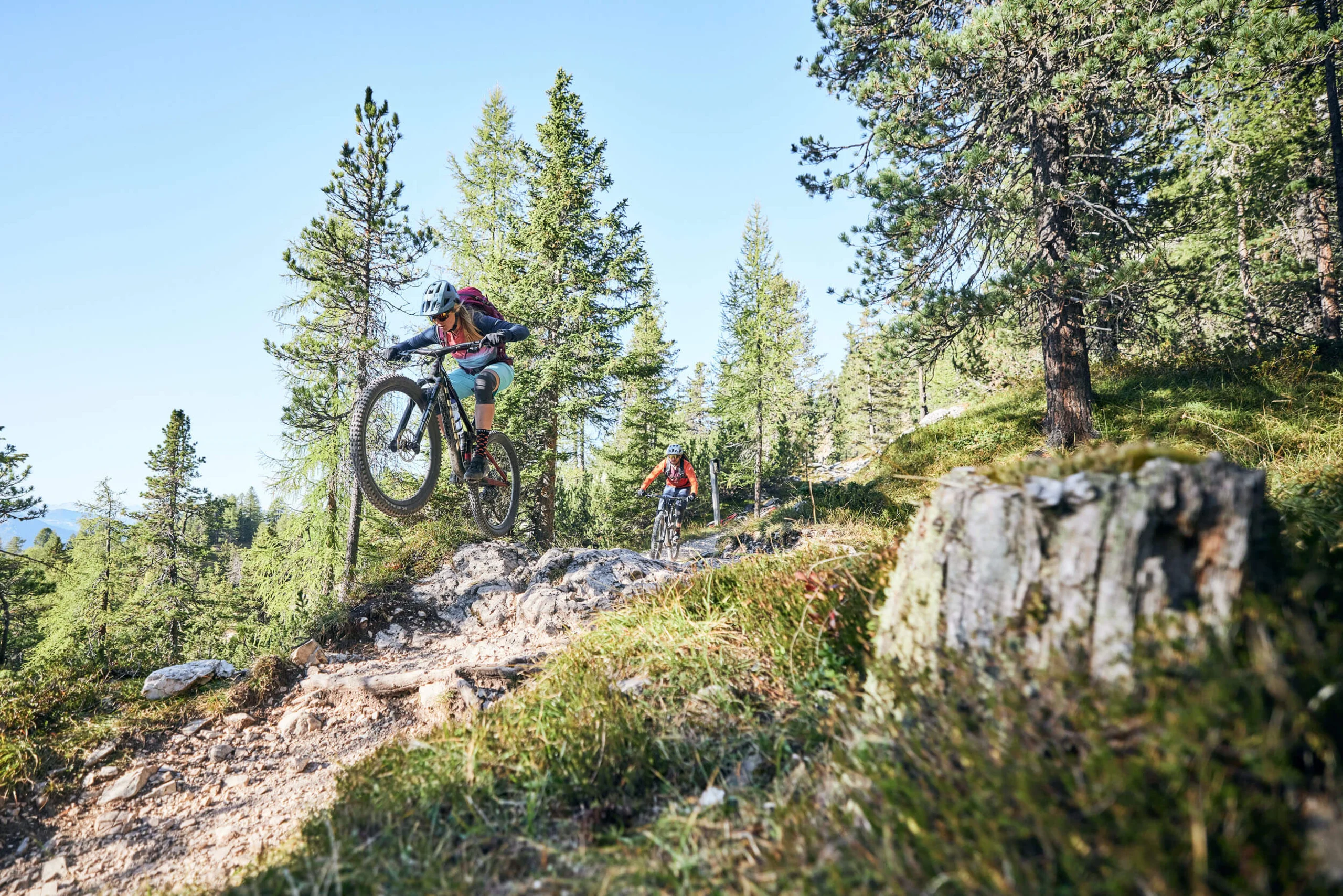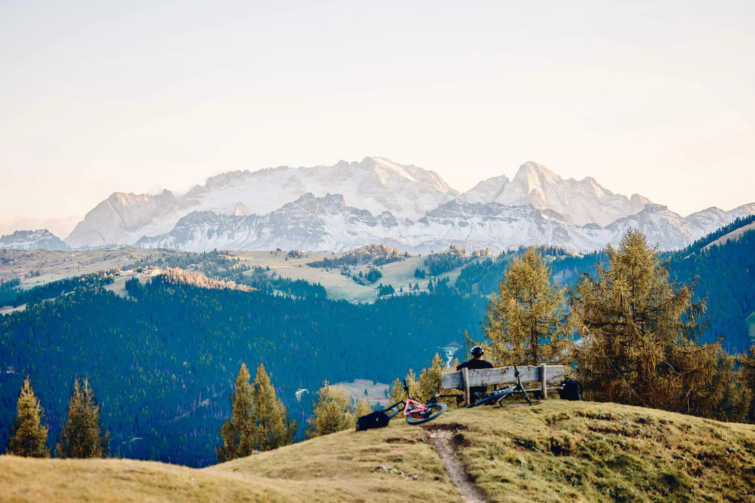 1968 eröffneten Reinhold und Günther Messner die Route Mittelpfeiler am Heiligkreuzkofel – damals eine der schwierigsten Bergsteigerrouten überhaupt. Heute sitzen wir auf unseren Bikes mit Blick auf genau diesen Gipfel und nähern uns ihm auf eine ganz andere Weise. Alleine dieser Gedanke beflügelt und lässt uns voller Entdeckergeist ins hochalpine Bikeabenteuer des Singletrails Nº15 starten.