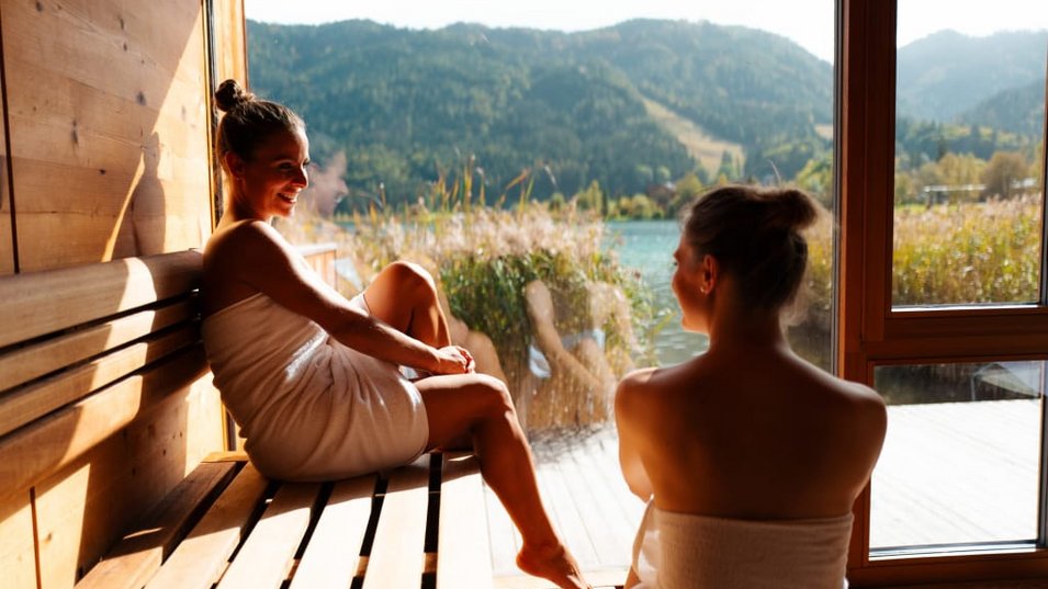 - See-Spa am Privatstrand mit Sauna direkt am Weissensee und Panoramaliegeräume, Vitaloase: Wellnessbereich in unserem 4* Hotel mit 4 verschiedenen Saunen, Whirlpool, Fitness Center, Ruheraum