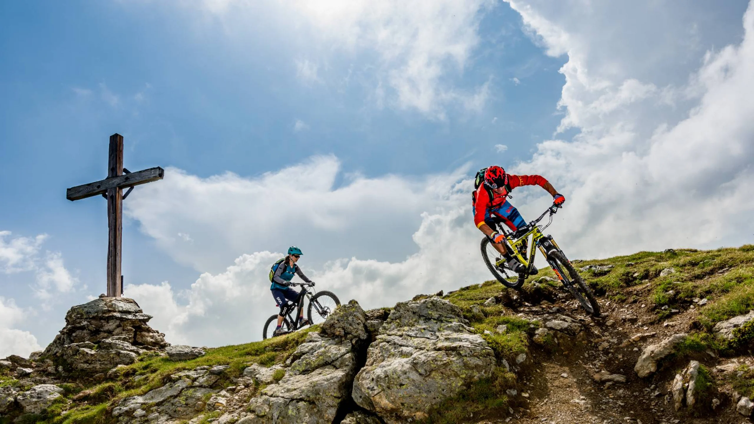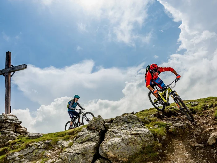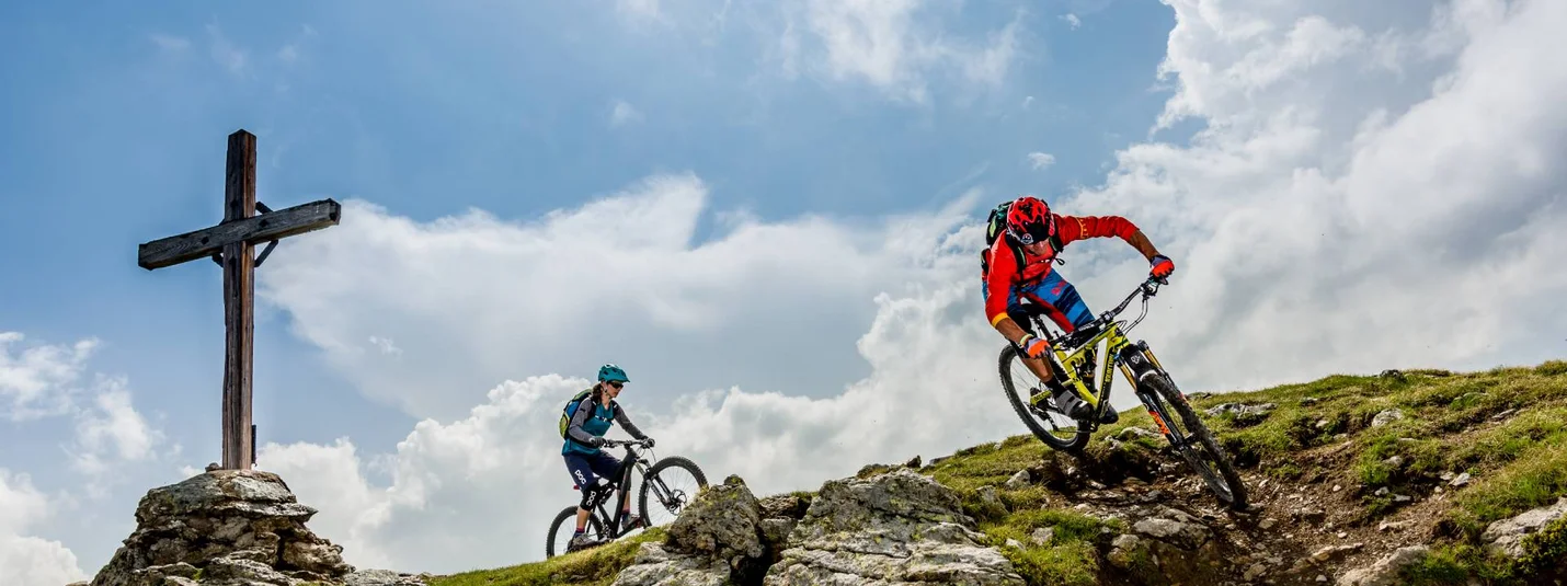 Der Signature Trail Herrnsteig in Bruneck – Dolomitenregion Kronplatz beginnt mit einigen Anliegern, Sprüngen und schnellen Querungen. Den Alpenhauptkamm und das tief liegende Pustertal hat man dabei immer im Blick. Nach einiger Zeit taucht man in den dichten Wald ein. Hier wird es steiler, wurzeliger und auch technischer.